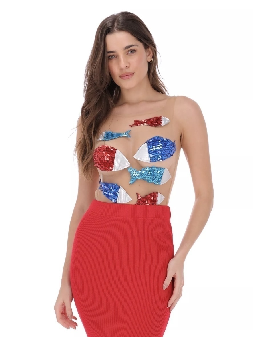 Body feminino em tule e lycra, combinando as cores azul e vermelho em um design único e vibrante. O modelo apresenta aplicações de lantejoulas em formato de peixes, conferindo um toque lúdico e sofisticado à peça.